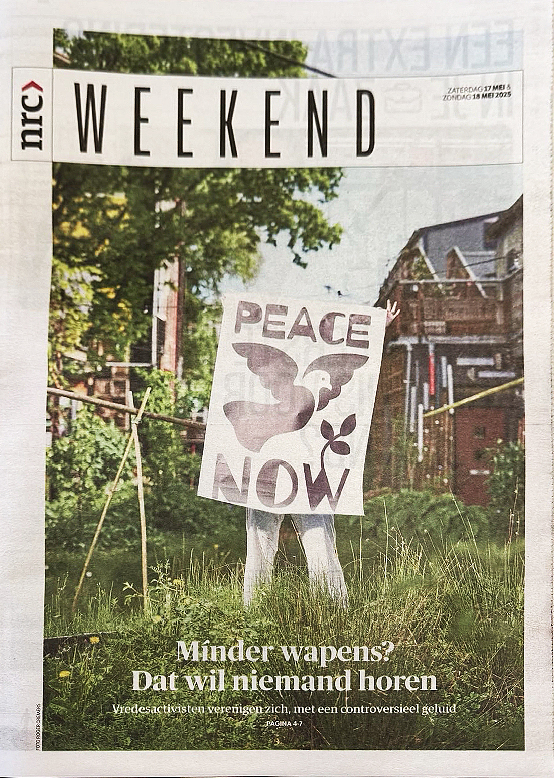 (2025_0518) The role of the poster is to stimulate discussion about the essential meaning of peace. Interview with Marije Lieuwens and other peace activists in Newspaper NRC Weekend, 17/18 May 2025. enlarge image